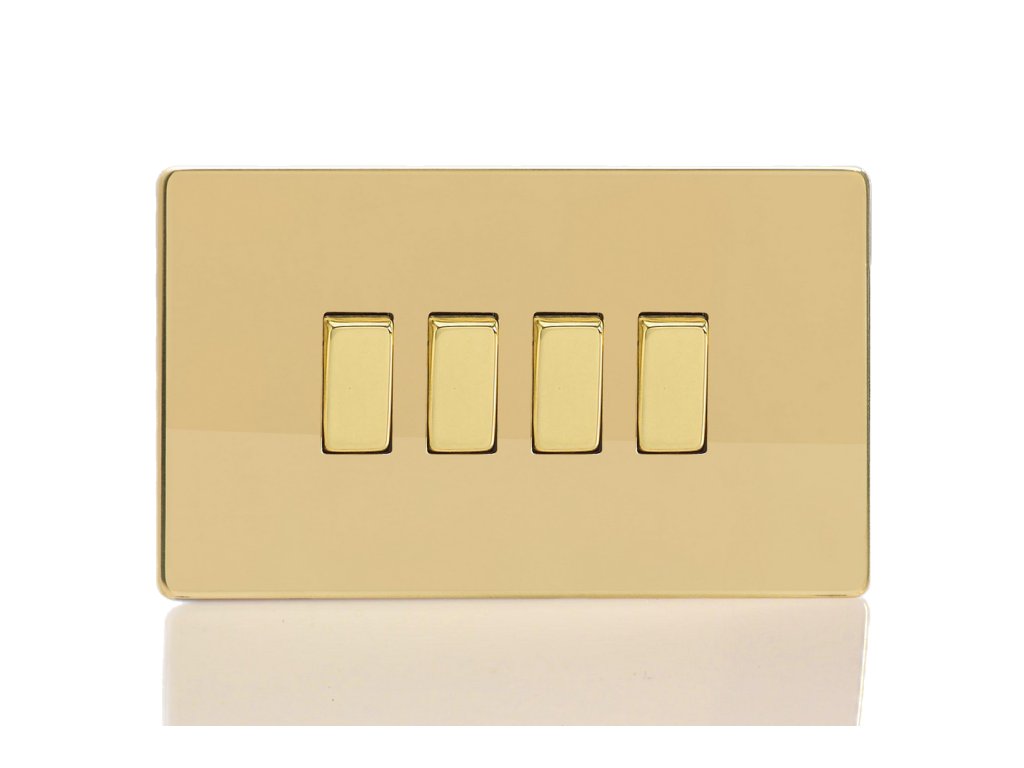 Kolébkový vypínač ROCKER - 4-modulový schodišťový (č.6); jednosměrný (č.1) 10A 1-pólový BEZŠROUBKOVÉ - leštěná mosaz / mosazné kolébky