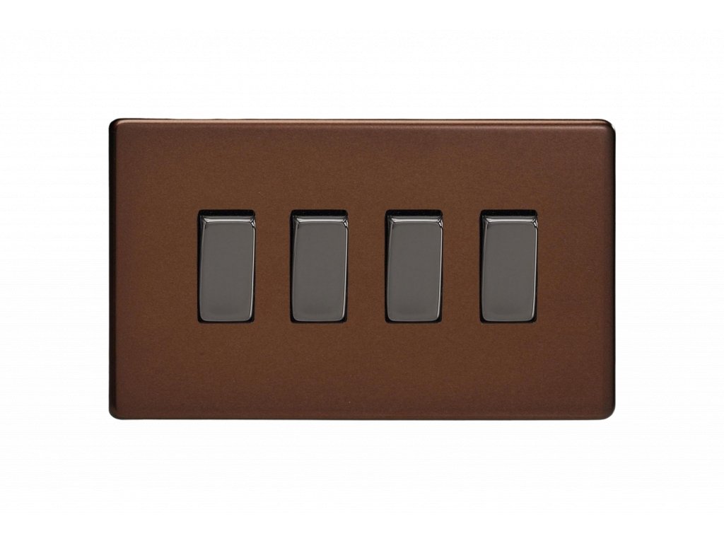 Kolébkový vypínač ROCKER - 4-modulový schodišťový (č.6); jednosměrný (č.1) 10A 1-pólový BEZŠROUBKOVÉ - moka / černé (lesklé) iridium