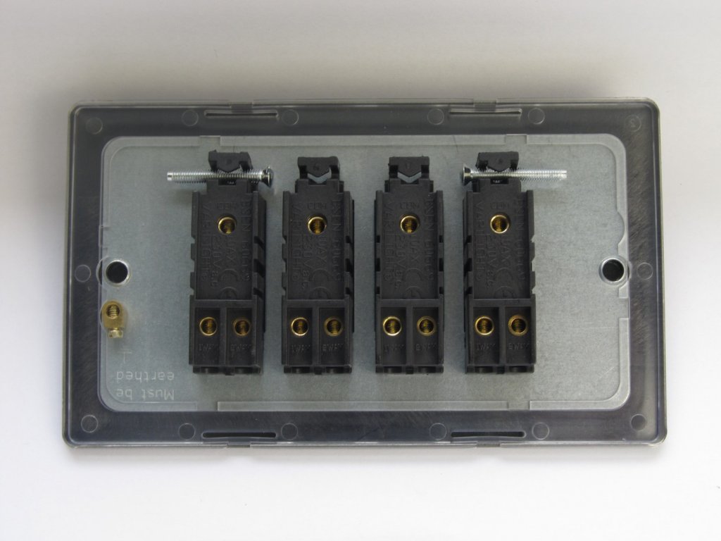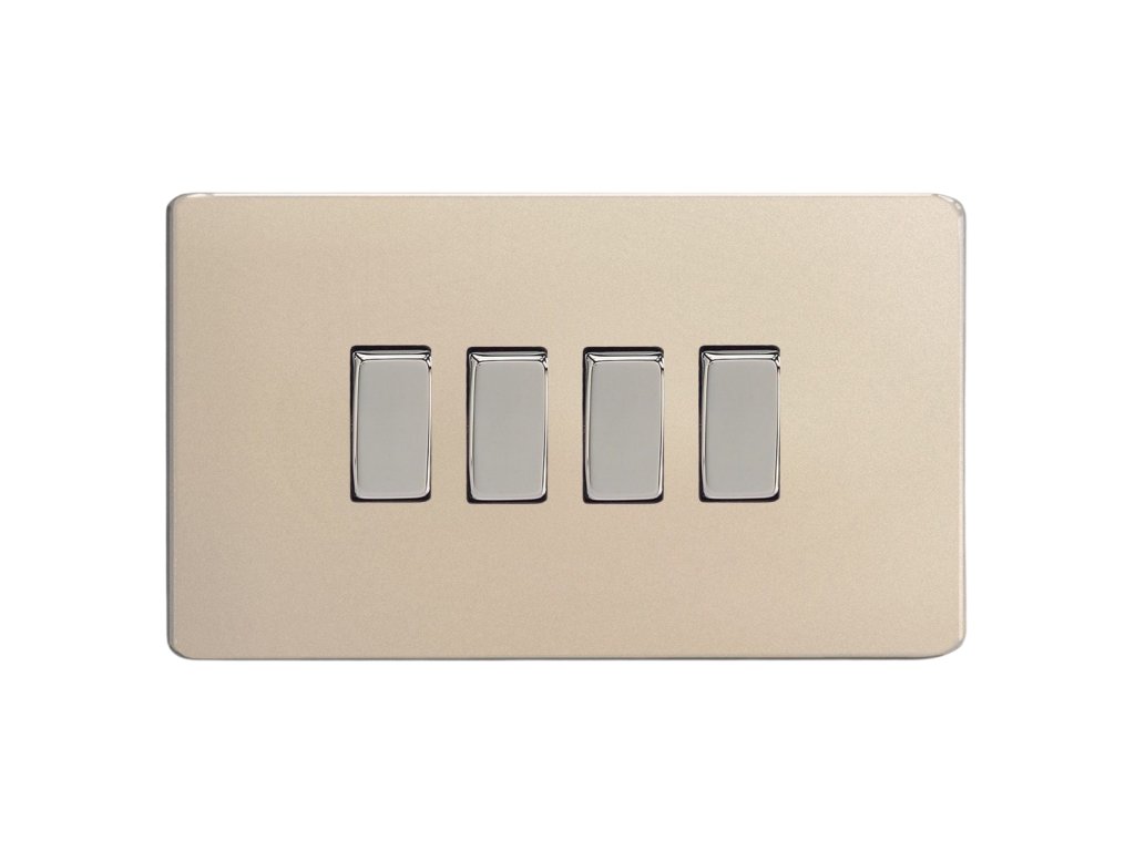 Kolébkový vypínač ROCKER - 4-modulový schodišťový (č.6); jednosměrný (č.1) 10A 1-pólový BEZŠROUBKOVÉ - satén / chromové kolébky