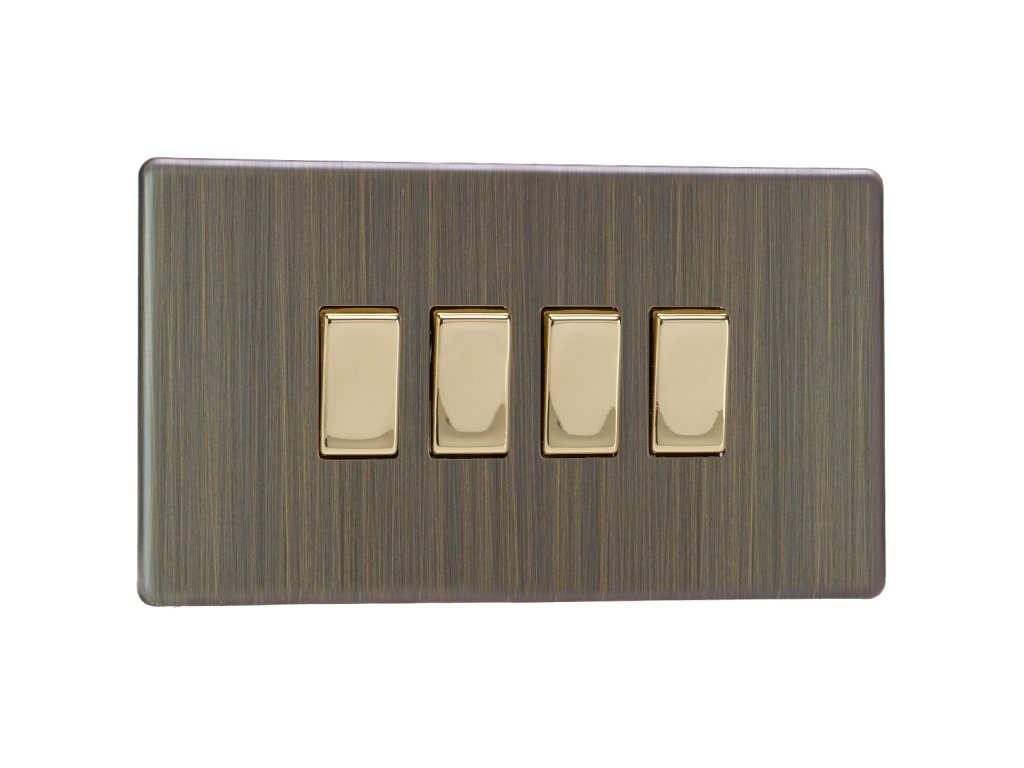 Kolébkový vypínač ROCKER - 4-modulový schodišťový (č.6); jednosměrný (č.1) 10A 1-pólový BEZŠROUBKOVÉ - starožitná mosaz / mosaz