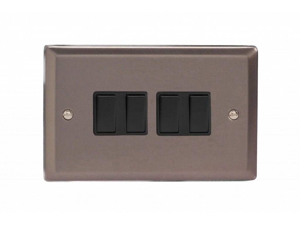 Kolébkový vypínač ROCKER - 4-modulový schodišťový (č.6); jednosměrný (č.1) 10A 1-pólový KLASICKÉ - cínová / černé kolébky