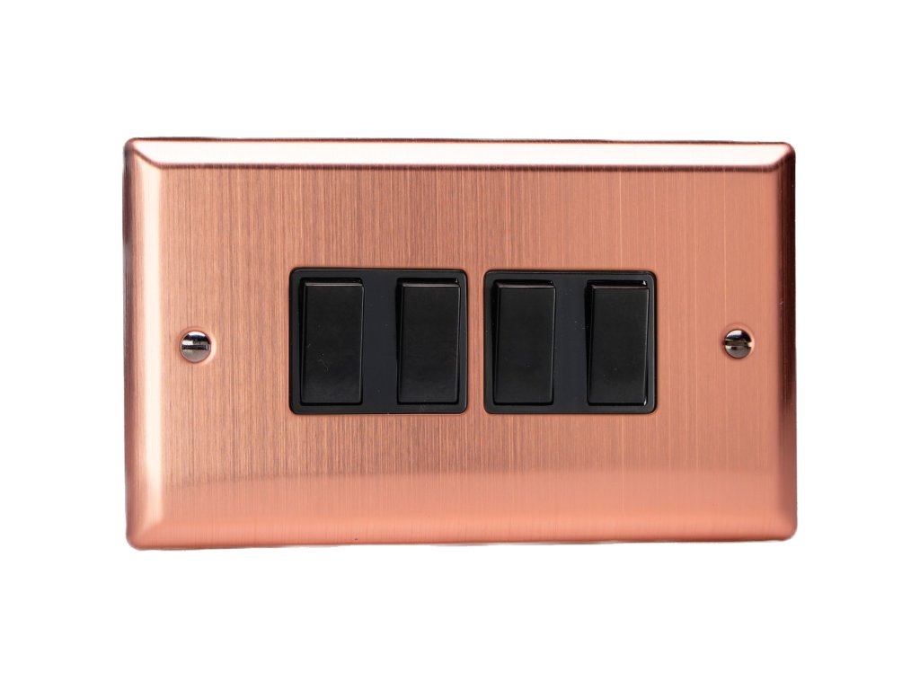 Kolébkový vypínač ROCKER - 4-modulový schodišťový (č.6); jednosměrný (č.1) 10A 1-pólový KLASICKÉ - kartáčovaná měď / černé kolébky