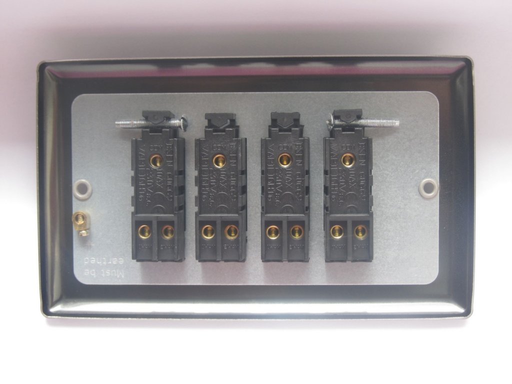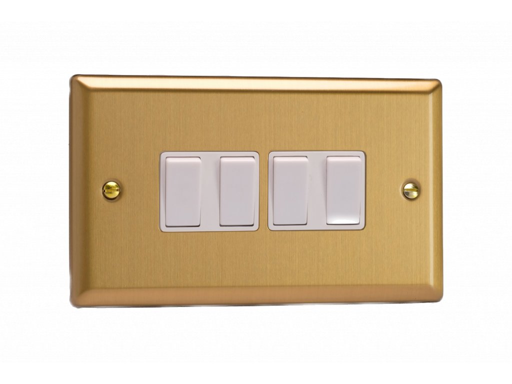 Kolébkový vypínač ROCKER - 4-modulový schodišťový (č.6); jednosměrný (č.1) 10A 1-pólový KLASICKÉ - kartáčovaná mosaz / bílé kolébky