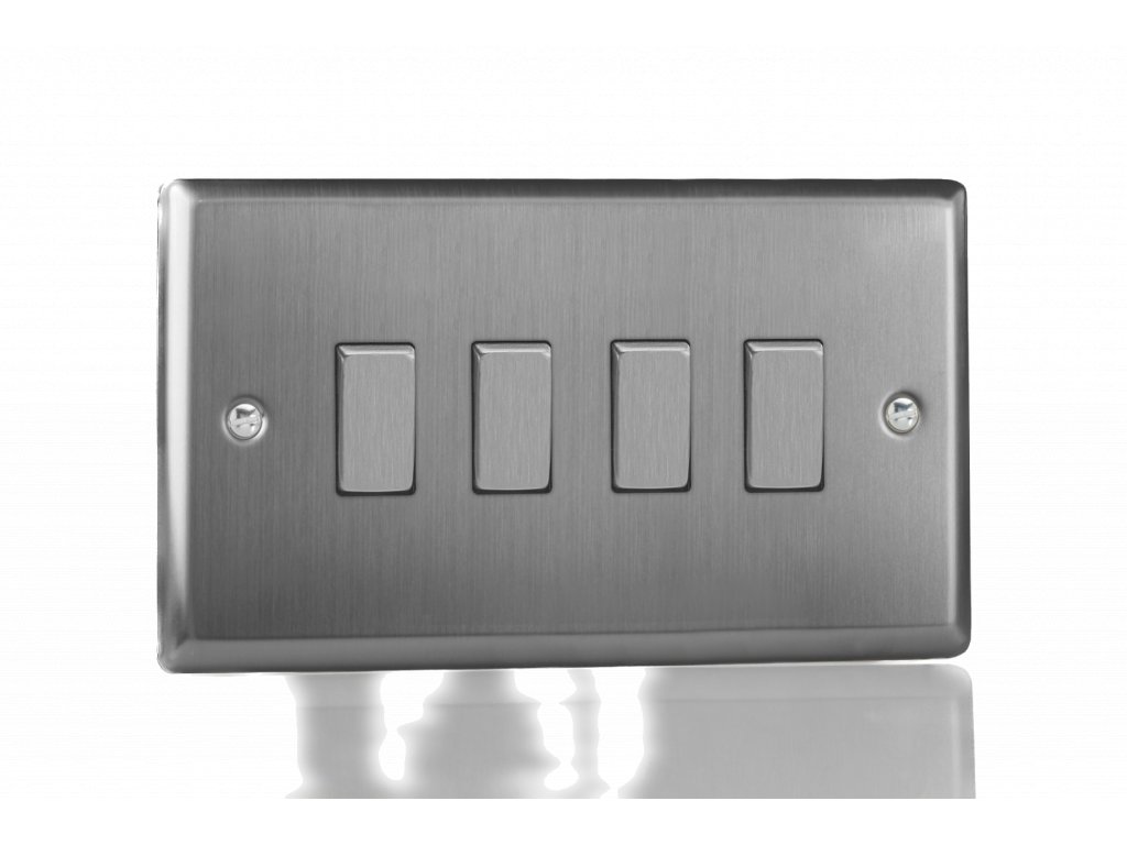 Kolébkový vypínač ROCKER - 4-modulový schodišťový (č.6); jednosměrný (č.1) 10A 1-pólový KLASICKÉ - kartáčovaná ocel / ocelové kolébky
