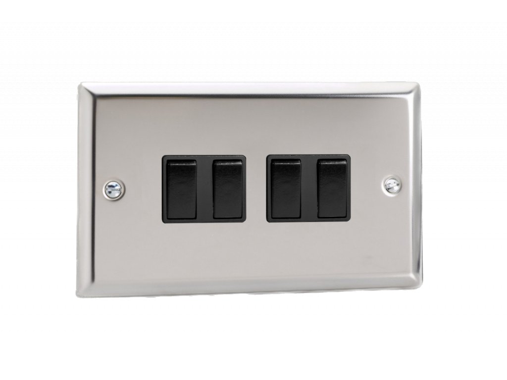 Kolébkový vypínaè ROCKER - 4-modulový schodiový (è.6); jednosmìrný (è.1) 10A 1-pólový KLASICKÉ - letìný chrom / èerné kolébky