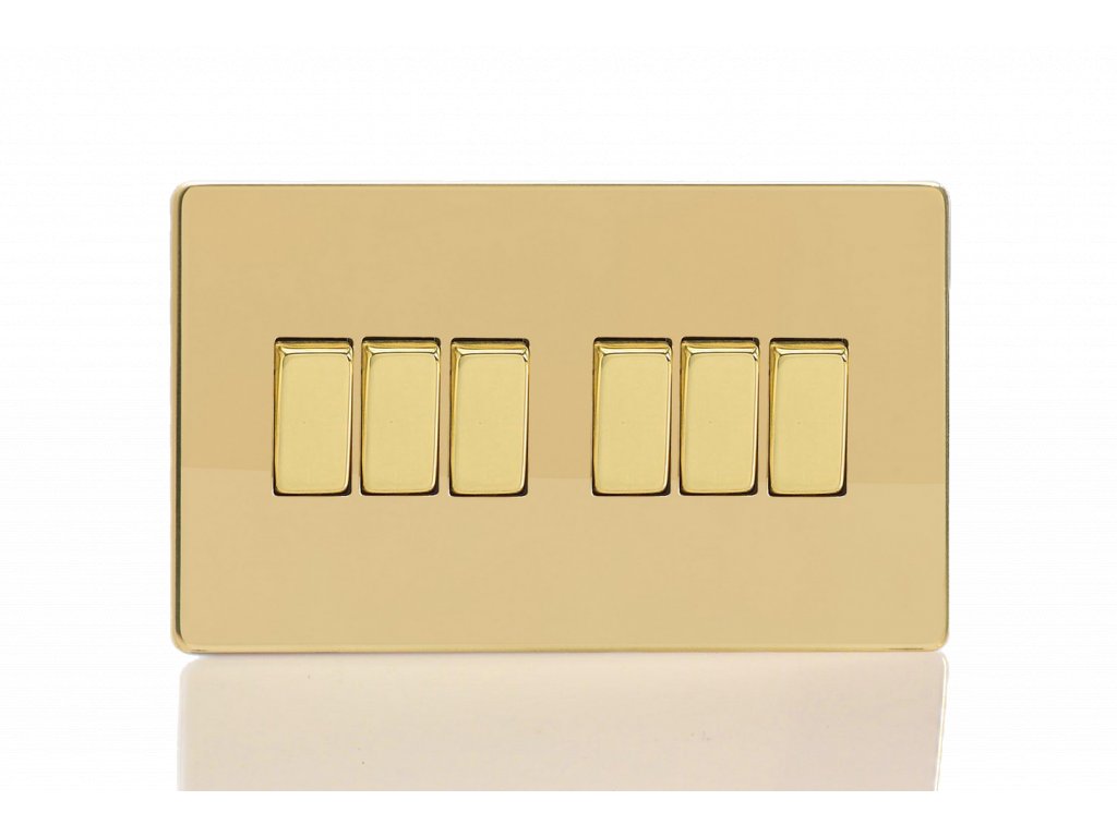 Kolébkový vypínač ROCKER - 6-modulový schodišťový (č.6); jednosměrný (č.1) 10A 1-pólový BEZŠROUBKOVÉ - leštěná mosaz / mosazné kolébky