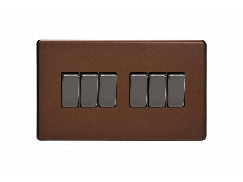 Kolébkový vypínač ROCKER - 6-modulový schodišťový (č.6); jednosměrný (č.1) 10A 1-pólový BEZŠROUBKOVÉ - moka / černé (lesklé) iridium