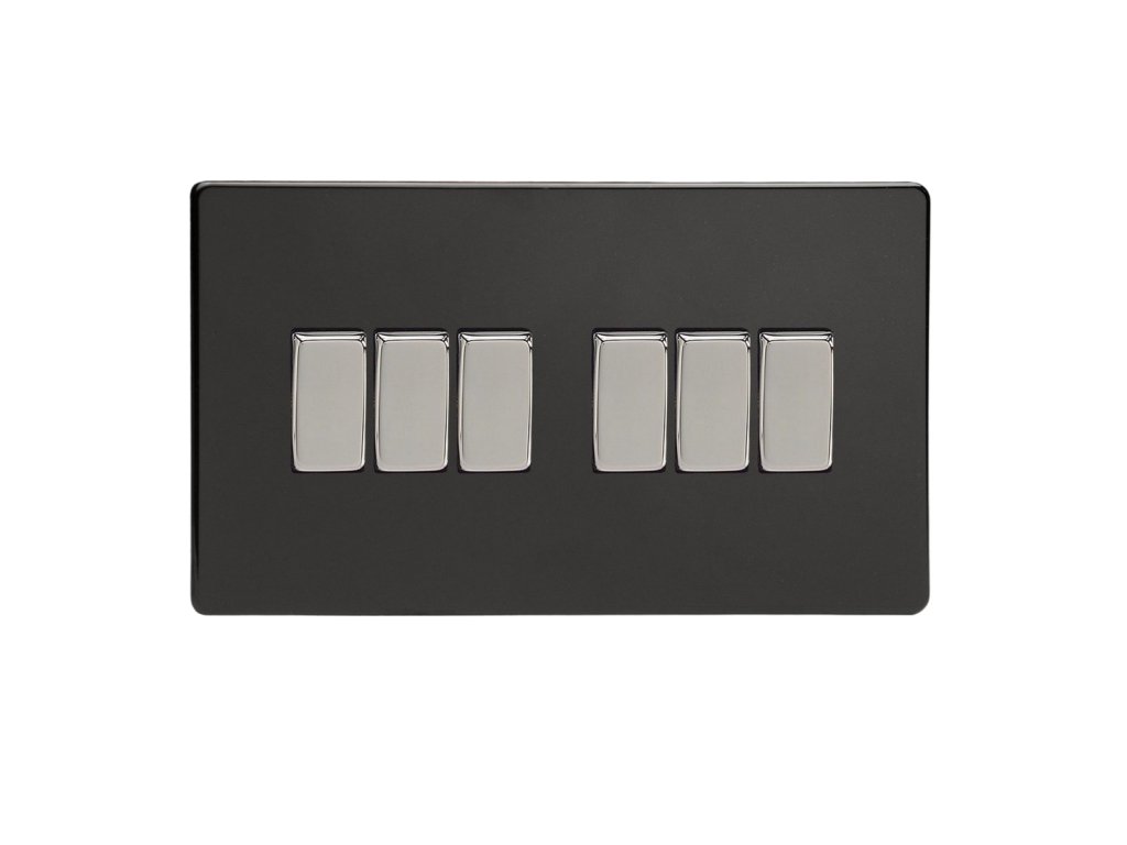 Kolébkový vypínač ROCKER - 6-modulový schodišťový (č.6); jednosměrný (č.1) 10A 1-pólový BEZŠROUBKOVÉ - prémiová černá / chromové kolébky