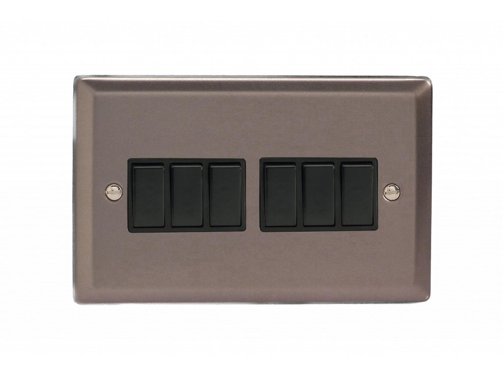 Kolébkový vypínač ROCKER - 6-modulový schodišťový (č.6); jednosměrný (č.1) 10A 1-pólový KLASICKÉ - cínová / černé kolébky