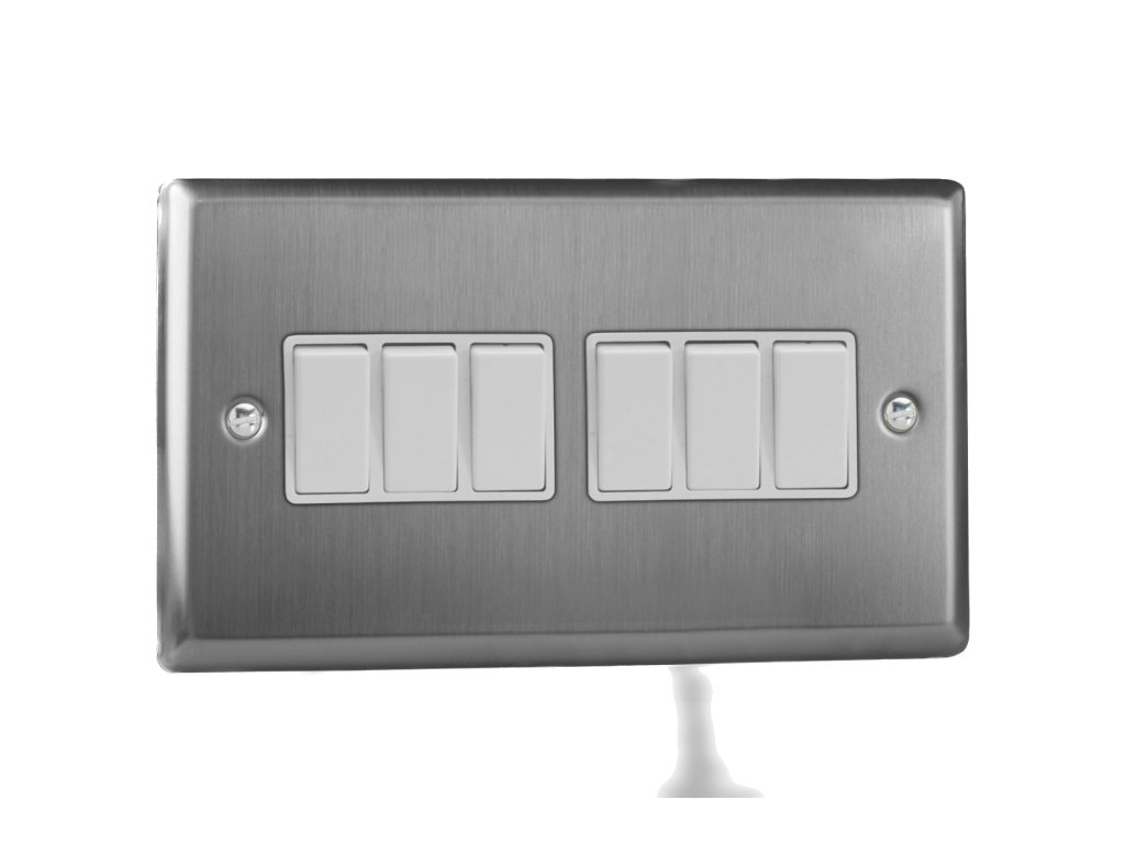 Kolébkový vypínaè ROCKER - 6-modulový schodiový (è.6); jednosmìrný (è.1) 10A 1-pólový KLASICKÉ - kartáèovaná ocel / bílé kolébky