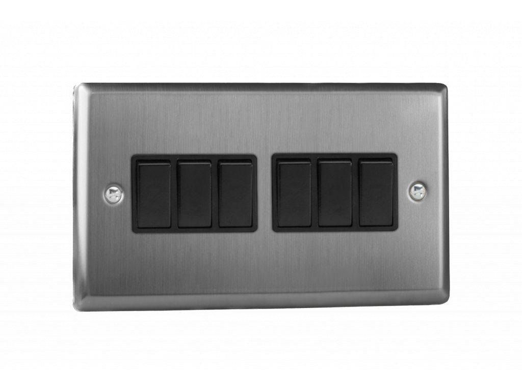 Kolébkový vypínaè ROCKER - 6-modulový schodiový (è.6); jednosmìrný (è.1) 10A 1-pólový KLASICKÉ - kartáèovaná ocel / èerné kolébky