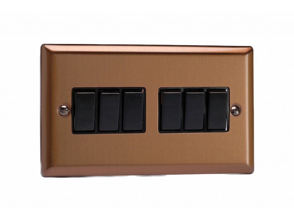 Kolébkový vypínač ROCKER - 6-modulový schodišťový (č.6); jednosměrný (č.1) 10A 1-pólový KLASICKÉ - kartáčovaný bronz / černá