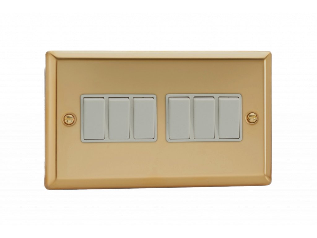 Kolébkový vypínaè ROCKER - 6-modulový schodiový (è.6); jednosmìrný (è.1) 10A 1-pólový KLASICKÉ - letìná mosaz / bílé kolébky