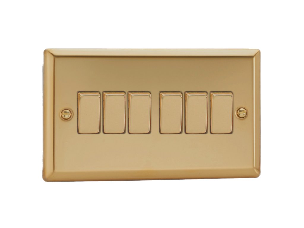 Kolébkový vypínaè ROCKER - 6-modulový schodiový (è.6); jednosmìrný (è.1) 10A 1-pólový KLASICKÉ - letìná mosaz / mosazné kolébky