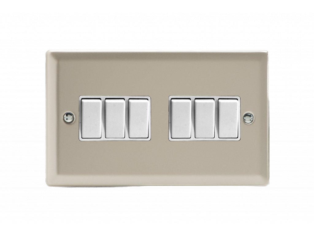 Kolébkový vypínač ROCKER - 6-modulový schodišťový (č.6); jednosměrný (č.1) 10A 1-pólový KLASICKÉ - satén / bílé kolébky