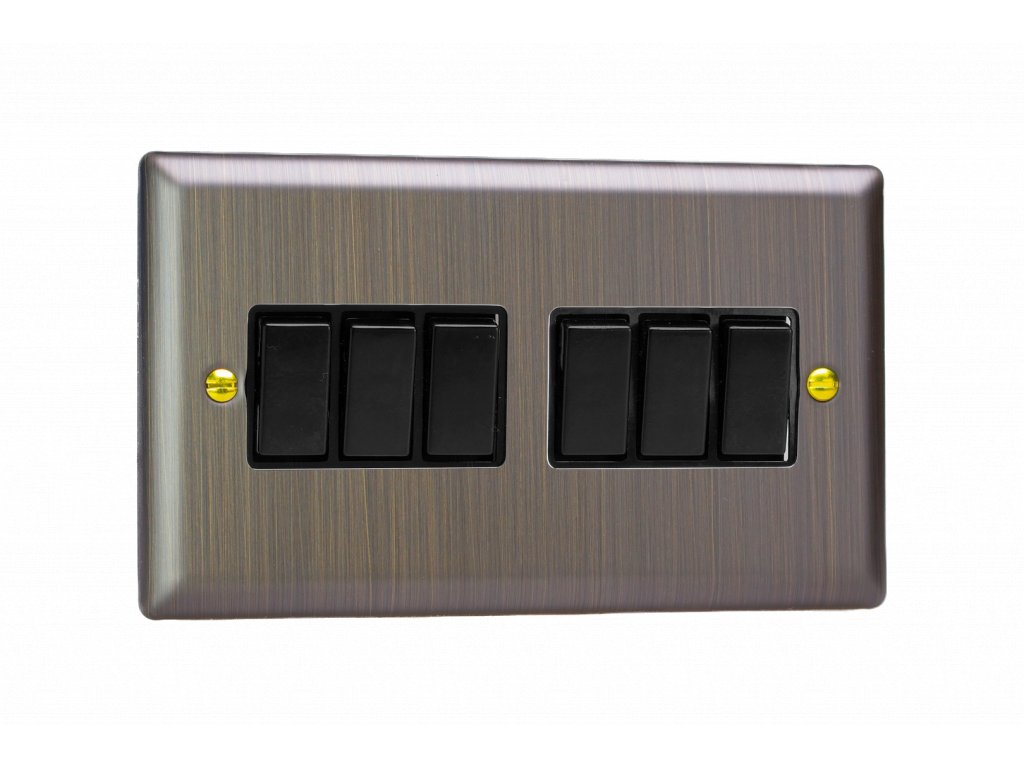 Kolébkový vypínaè ROCKER - 6-modulový schodiový (è.6); jednosmìrný (è.1) 10A 1-pólový KLASICKÉ - staroitná mosaz / èerná