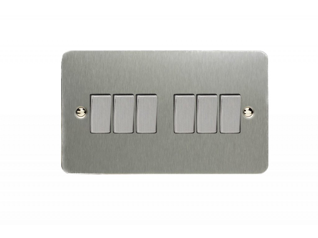 Kolébkový vypínaè ROCKER - 6-modulový schodiový (è.6); jednosmìrný (è.1) 10A 1-pólový ULTRAPLOCHÉ - kartáèovaná ocel / ocelové kolébky