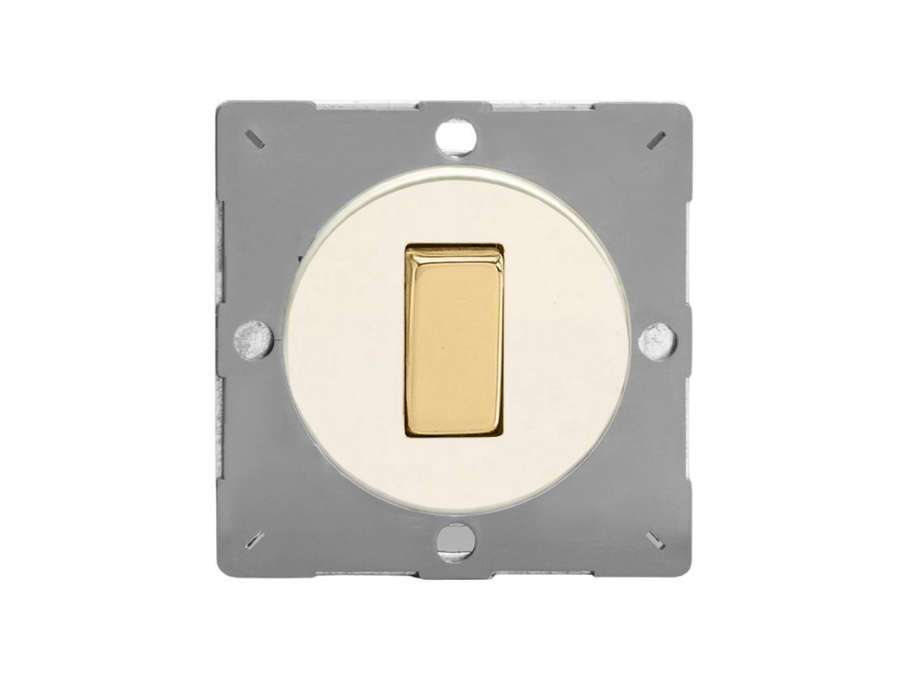 Kolébkový vypínač ROCKER - 1-modulový schodišťový (č.6); jednosměrný (č.1) 10A 1-pólový MODULÁRNÍ - matně bílá / mosazná kolébka