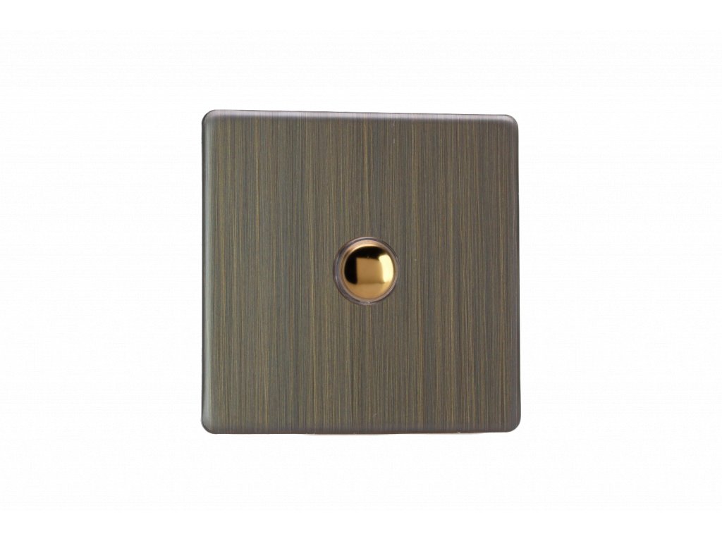 Tlačítkový vypínač IMPULSE - 1-modulový jednosměrný (č.1) 6A 1-pólový momentový BEZŠROUBKOVÉ - starožitná mosaz / mosaz