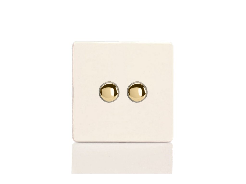 Tlačítkový vypínač IMPULSE - 2-modulový schodišťový (č.6); jednosměrný (č.1) 6A 1-pólový BEZŠROUBKOVÉ - matně bílá / mosazná tlačítka