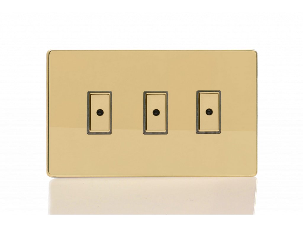 Tlaèítkový vypínaè IMPULSE - 3-modulový jednosmìrný (è.1) 0-100 W (max 10 LEDs) 1.1A 1-pólový LED s dálkovým V-Pro BEZROUBKOVÉ - letìná mosaz / mosazná tlaèítka