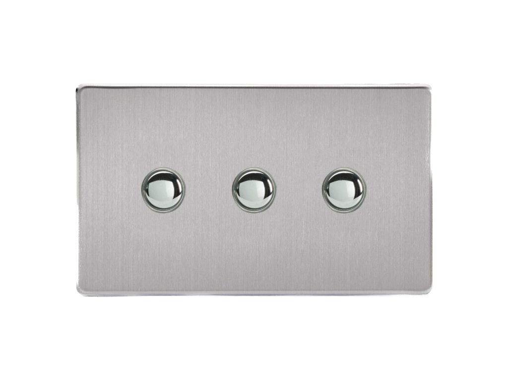 Tlačítkový vypínač IMPULSE - 3-modulový jednosměrný (č.1) 6A 1-pólový momentový BEZŠROUBKOVÉ - kartáčovaná ocel / chromová tlačítka