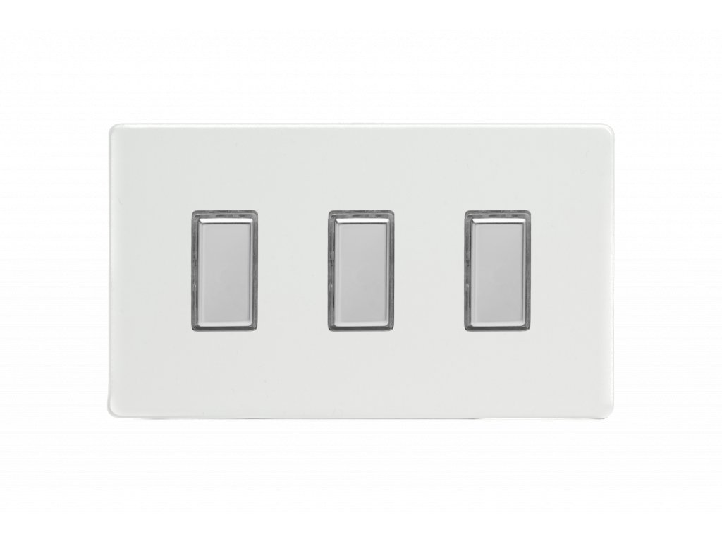 Tlaèítkový vypínaè IMPULSE - 3-modulový schodiový (è.6) 1-pólový BEZROUBKOVÉ - prémiová bílá / chromová tlaèítka