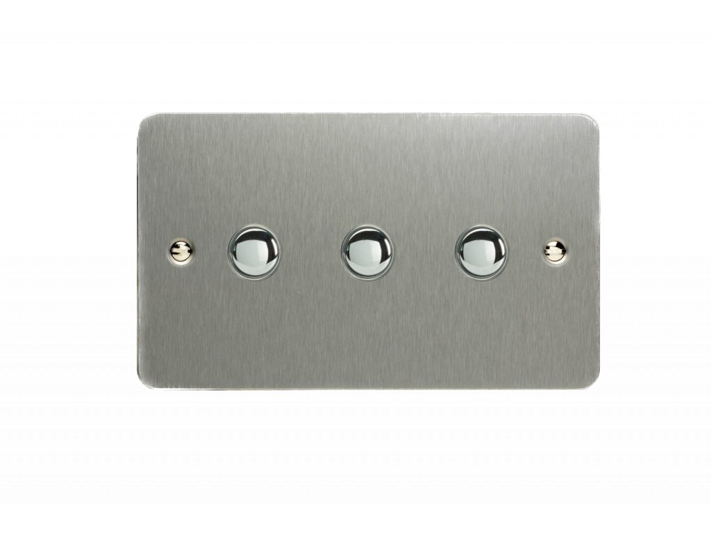 Tlačítkový vypínač IMPULSE - 3-modulový schodišťový (č.6); jednosměrný (č.1) 6A 1-pólový ULTRAPLOCHÉ - kartáčovaná ocel / chromová tlačítka