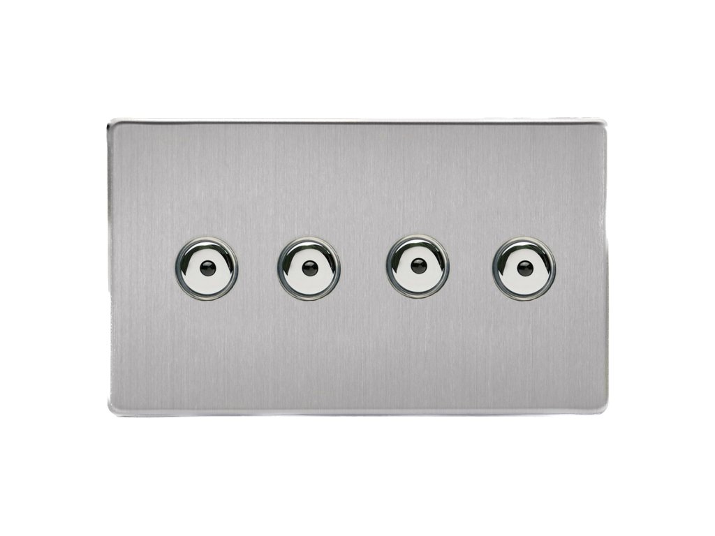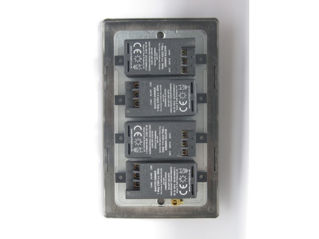 Tlačítkový vypínač IMPULSE - 4-modulový jednosměrný (č.1) 0-100 W (max 10 LEDs) 0.7A 1-pólový LED s dálkovým BEZŠROUBKOVÉ - kartáčovaná ocel / chromová tlačítka