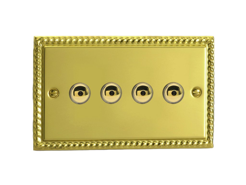 Tlaèítkový vypínaè IMPULSE - 4-modulový jednosmìrný (è.1) 0-100 W (max 10 LEDs) 0.7A 1-pólový LED s dálkovým KLASICKÉ - letìná mosaz / mosazná tlaèítka