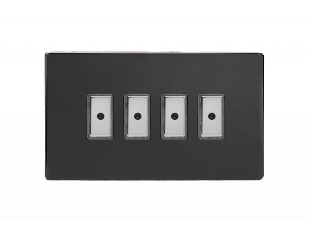 Tlačítkový vypínač IMPULSE - 4-modulový jednosměrný (č.1) 0-100 W (max 10 LEDs) 0.7A 1-pólový LED s dálkovým V-Pro BEZŠROUBKOVÉ - prémiová černá / chromová tlačítka