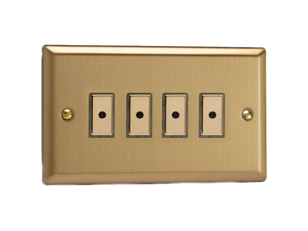Tlaèítkový vypínaè IMPULSE - 4-modulový jednosmìrný (è.1) 0-100 W (max 10 LEDs) 0.7A 1-pólový LED s dálkovým V-Pro KLASICKÉ - kartáèovaná mosaz / mosazná tlaèítka