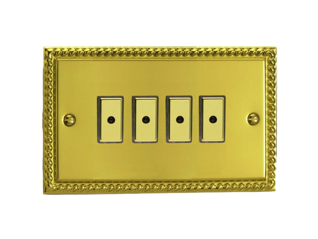 Tlačítkový vypínač IMPULSE - 4-modulový jednosměrný (č.1) 0-100 W (max 10 LEDs) 0.7A 1-pólový LED s dálkovým V-Pro KLASICKÉ - leštěná mosaz / mosazná tlačítka