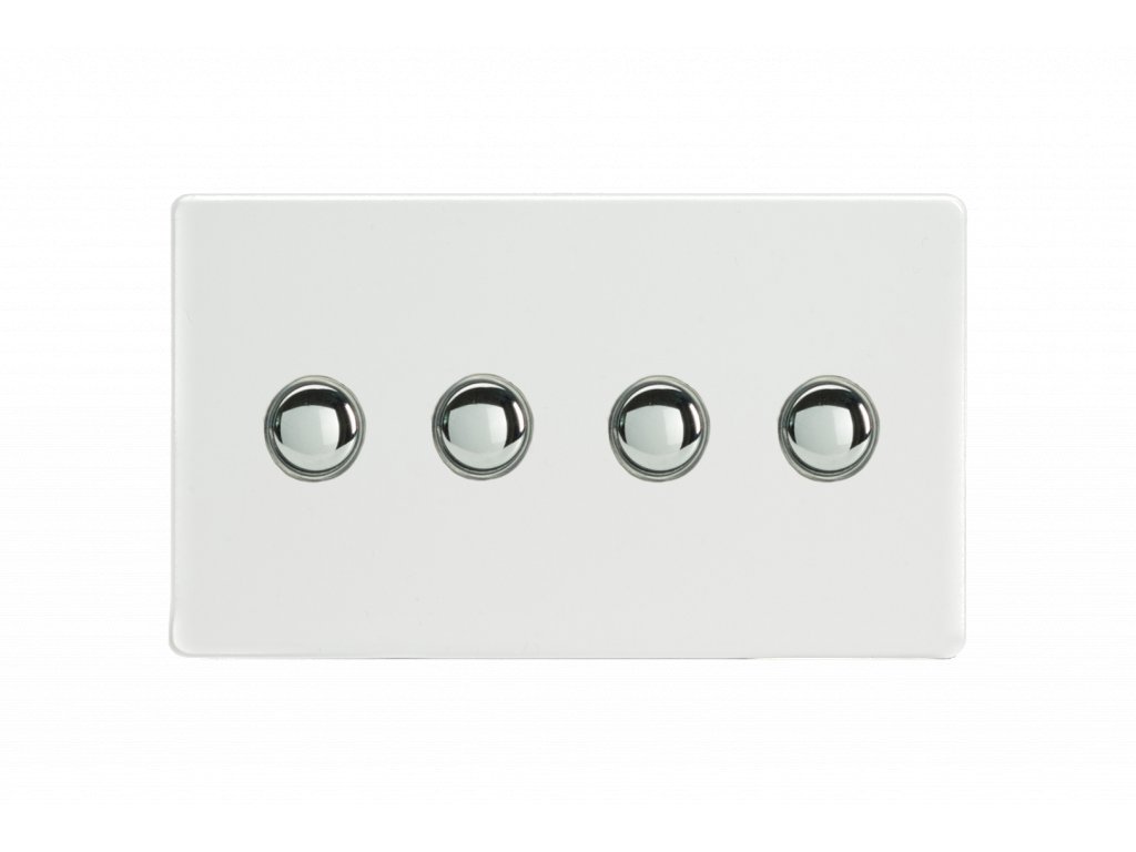 Tlaèítkový vypínaè IMPULSE - 4-modulový jednosmìrný (è.1) 6A 1-pólový momentový BEZROUBKOVÉ - prémiová bílá / chromová tlaèítka