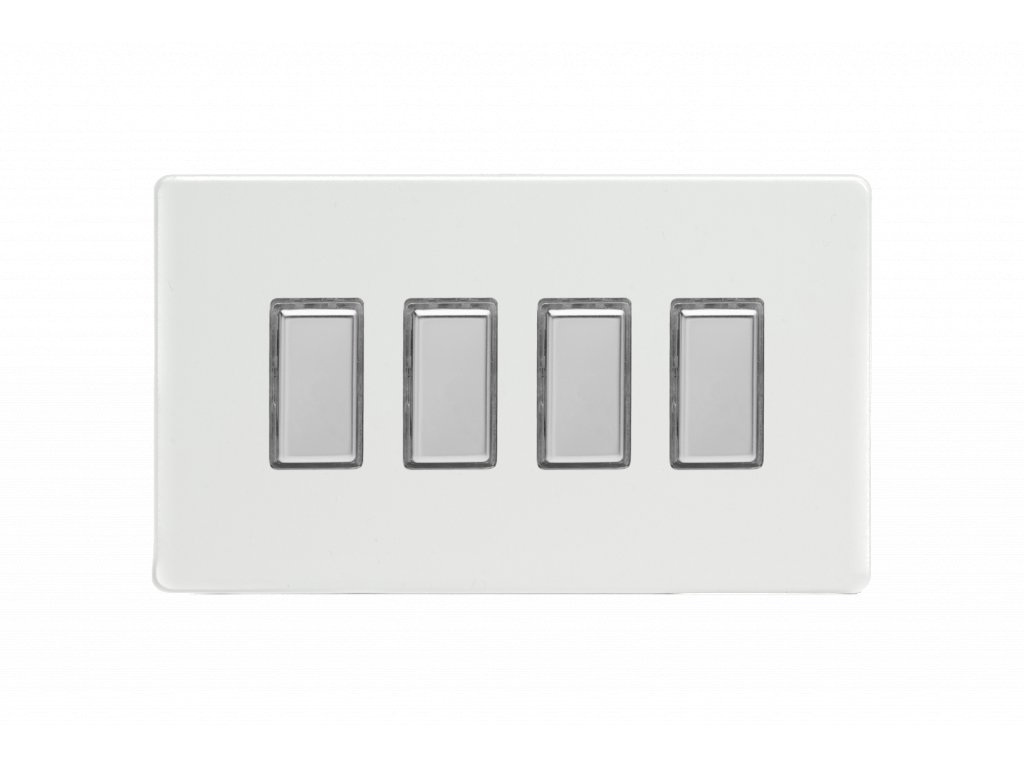 Tlaèítkový vypínaè IMPULSE - 4-modulový schodiový (è.6) 1-pólový BEZROUBKOVÉ - prémiová bílá / chromová tlaèítka