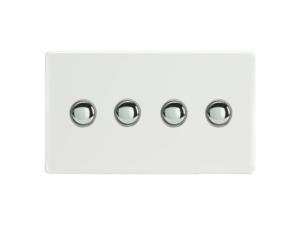 Tlaèítkový vypínaè IMPULSE - 4-modulový schodiový (è.6); jednosmìrný (è.1) 6A 1-pólový BEZROUBKOVÉ - prémiová bílá / chromová tlaèítka